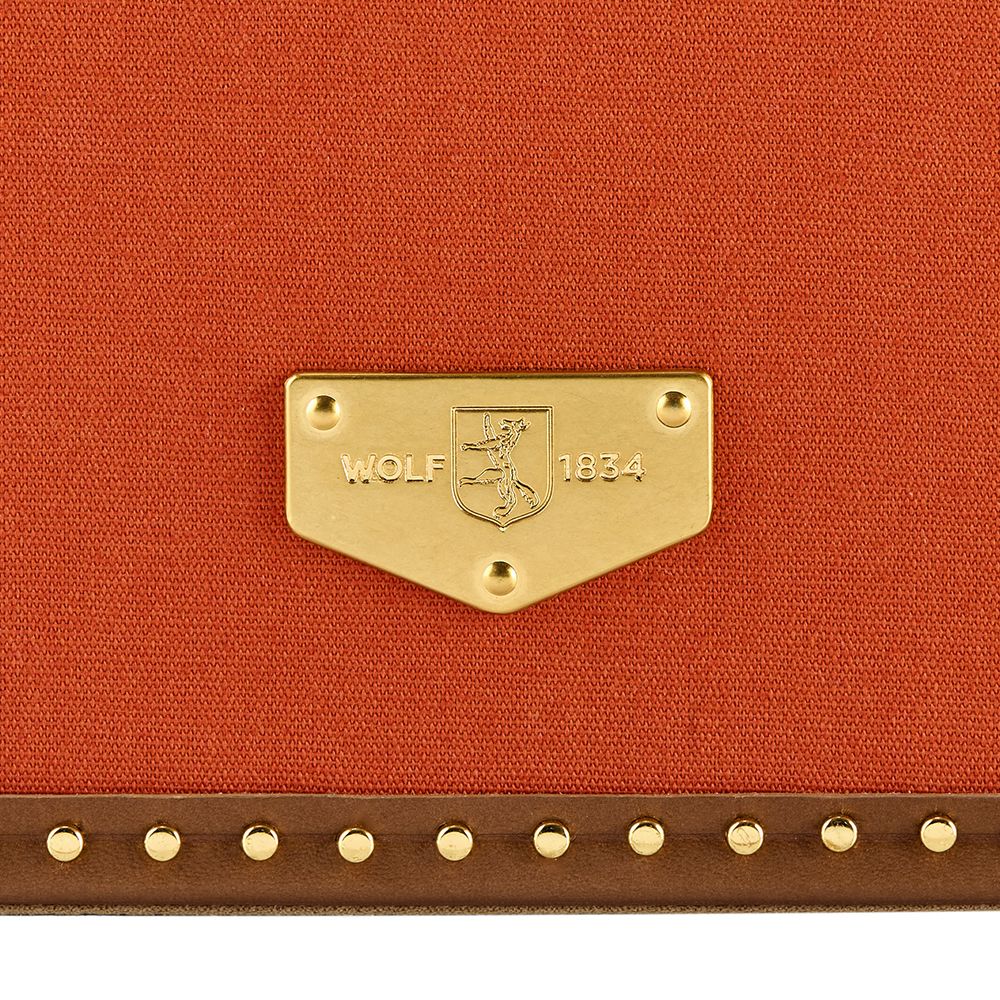 Ida, a trunk-style jewellery box featuring a recycled canvas exterior in luxurious muted tones with top-grain leather trim, brass stud detailing, a custom lock, and the exclusive 190th Anniversary logo plate. Inside, the LusterLoc™ treated Ultrasuede lining features multiple compartments, ring slots, covered trays, and three drawers with compartments, including a small travel case. The perfect blend of elegance and functionality inspired by Ida’s travel trunk.